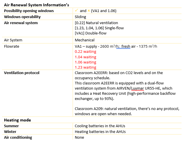 - The HVAC system is equipped with a main AHU, which is equipped with filters M5 + F7 and serves several classrooms. Then the air pass in several AHUs dedicated to specific classrooms that promote the recirculation of the air and are equipped with filters G4 + F7.